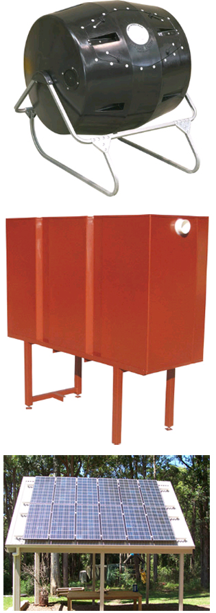 Images (top to bottom): Ezyroll Compost Barrow, AquaTank, Solar Panels