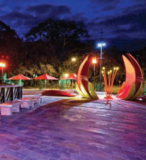 Extensive lighting creates dramatic effects at night and highlights the features of the project, including artworks.