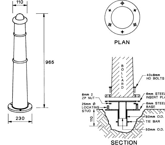 Manufactured to stand the test of time, bollards are supplied in black semi gloss as standard. Special colours available on request. Suitable for concreting into positions or can be drilled and bolted down if required or fitted with a removable base for occasional access. Chain rings available on request.