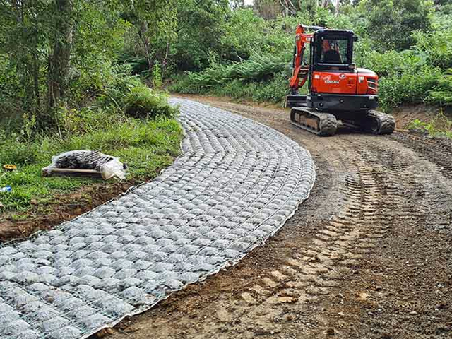 The concrete mats provided a perfect solution. The stable hard armoured surface, permeable to allow the water to drain away, the flexible mat was easily installed to shape around the curves of the road. Runoff drains were also lined with concrete mats.