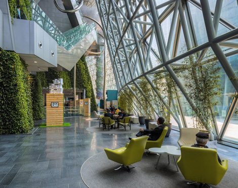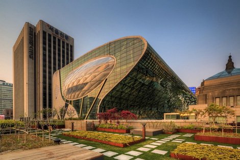 iArc Architects designed Seoul’s new city hall as the bridge between the city’s history and sustainability-minded future. Connected to the old city hall by an elevated bridge, the new government building also overlooks neighbouring Seoul Plaza, a symbol of forward-thinking and environmentally friendly principles. Visually, the building was designed as an extension of the eco-friendly plaza and includes a living green wall as well as an adaptive window shade system that opens and closes to mitigate solar heat gain.