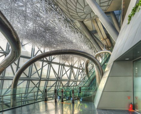 In contrast to the typical staidness of government buildings, the city hall consists of a modern, whimsical design that promotes transparency and interactivity. Natural light floods the white and stainless steel interior, highlighting colourful artistic installations as well as the glittering metallic beams that curve above tall escalators linking multiple floors.