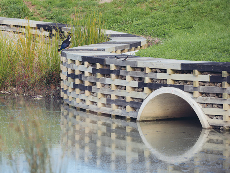 This concept was developed between Isthmus and Rawstorne Studios and utilises a standard crib retaining system to create the structures that together form a skate park and planting areas and support reed-bed filers that were created by repopulating the site with native plant species. The interlocking timber structures offer habitats for plant and animal life, and due to their permeable and flexible nature will shift and change, allowing the ecology to flow over time.