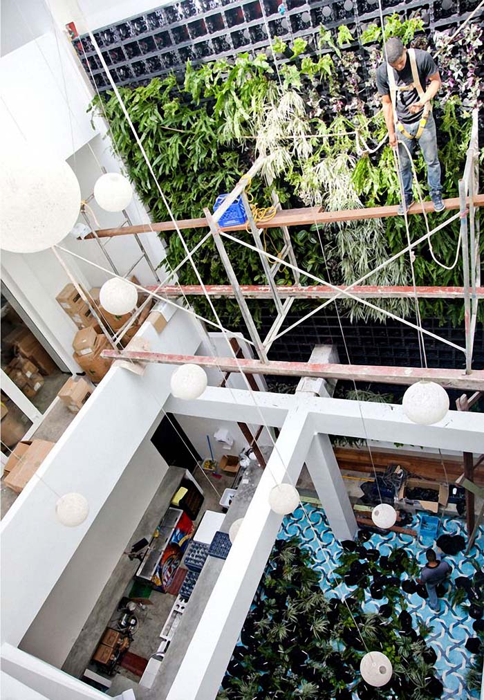 The ground floor lounge, with its UV-filtered atrium and two-storey green wall, is the hub of activity, where old suitcases get a second life as coffee tables. This is Panama’s first living interior wall.
