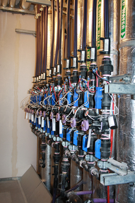 The Design Landscapes in-house hydraulics team installed a maze of specifically manufactured 75 mm high pressure mainlines through the buildings internal risers, with 19 kilometres of 25 mm lateral lines and 27 kilometres of drip lines delivering water to the individual planter boxes and green walls. Each of the 23 green wall panels has a different configuration of lateral lines and drip emitters with each line (up to 10 per panel) being switched via an independent solenoid for precise control. Each line is then set to different run durations so that the whole of the wall receives an equal volume of water.