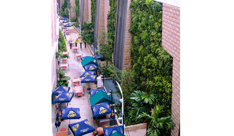 The living walls were installed in the alley which is situated outside the casino along the wall of the hotel and is designated as an area, inaccessible to non-casino patrons, where refreshments may be taken by casino patrons. Its orientation is such that, at certain times of the day, harsh sun rays will fall along the alley. The seven living walls alternating with water-feature panels with trickling water flow mitigates this to a large extent and also creates a cool and pleasant environment with lush tropical greenery and soothing sounds of water for patrons to enjoy, as opposed to bare uninteresting concrete walls along the narrow alley.