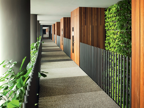 According to the architects, the incorporation of greenery is more than just an aesthetic statement. An essential element to its functionality, the green-filled balcony gardens that extend from every fourth floor allows the building respond to its environment in a manner that offsets its challenging climatic conditions. Jutting from the side of the building with regularity, the sky gardens provide shade for the hotel, keeping rooms cool without the need for external screens and providing internal ventilation.