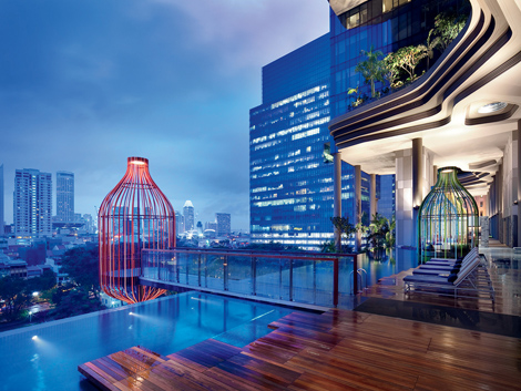 While fundamentally organic in nature, the architecture is cleverly planned and executed to create natural ventilation. Three linked towers form an E-shaped plan that sits on a central podium and offers views of greenery from every direction. The ground floor of the hotel is controlled right to the street edge with generous planting and covered walkways. The lobby and dining area are elevated slightly above passing pedestrians and traffic, the vertical transition handled by cascading water and plantings on both sides of a glass facade. The pool terrace on level 5 includes a 300-metre running track and suspended cabanas that resemble giant open lanterns. Vines drape vertically throughout the spaces to bridge the divide between the levels and scale the oversized dimensions of the public spaces. Lounge areas are open to the public and open onto a roof terrace suitable for private functions.