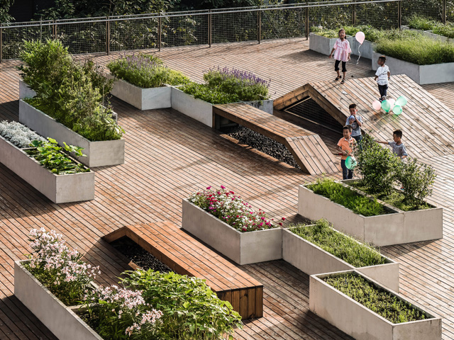 Concrete planters are scattered randomly about the terrace to generate a community garden, enticing people to plant various crops