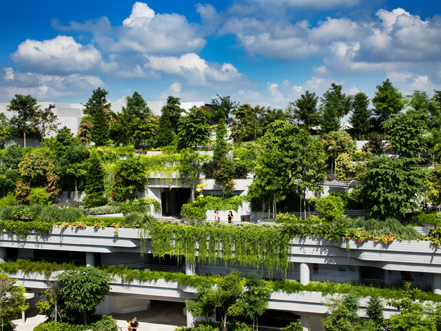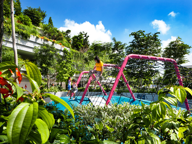 Perched above the Singapore skyline, this lush, multi-layered rooftop garden tops a prototypal development supporting ageing in place.