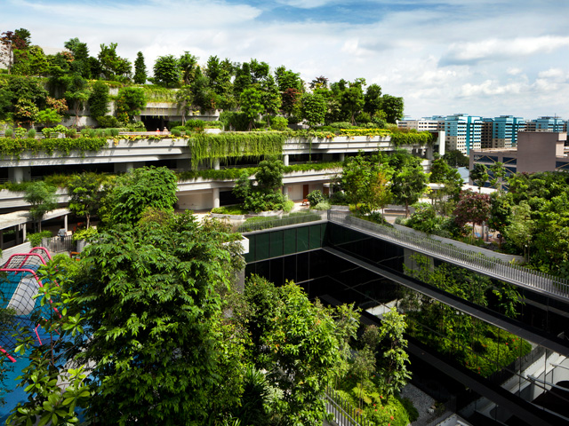 On the roof, landscaped terraces overflow with a verdant froth of greenery that runs wild in Singapore’s humid climate. Planted balconies spill greenery onto communal gathering spaces in which residents flock to utilise fitness equipment or just to meet and chat.