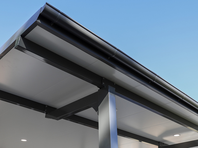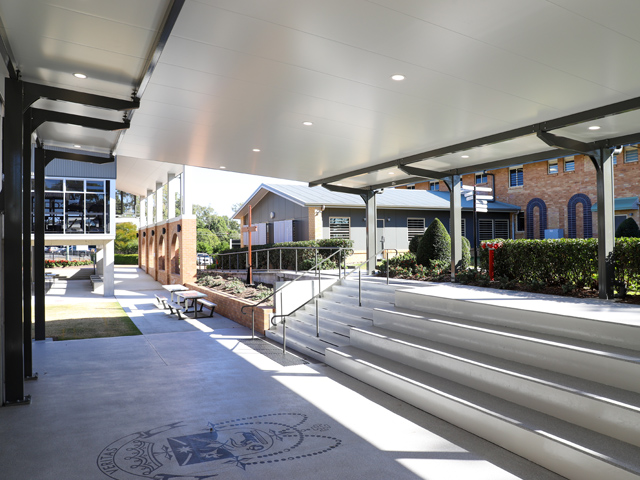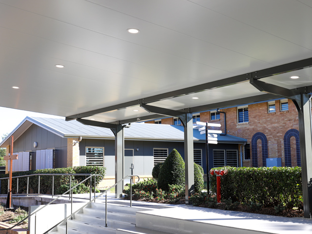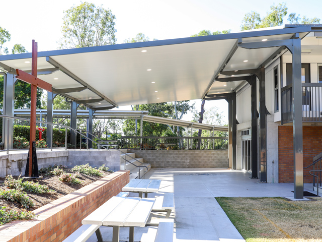 The modern and innovative design of the structure helps set the tone for the area. Insulated roof panels aid in maintaining a comfortable temperature for learning outdoors, while recessed lighting ensures adequate brightness no matter the weather. Six metre cantilevered posts of hot-dipped galvanised steel were painted in a two-part epoxy for strength and durability, as well as ensuring a good colour match to the existing architecture.