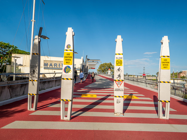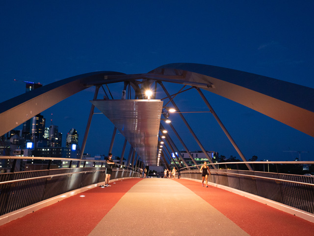 Spanning the Brisbane River, the Goodwill Bridge is a dedicated pedestrian and cycle way that links South Bank Parklands to Gardens Point in the Brisbane CBD. With over 40,000 pedestrians and cyclists utilising the bridge each week, this public infrastructure is a vital resource for the area.