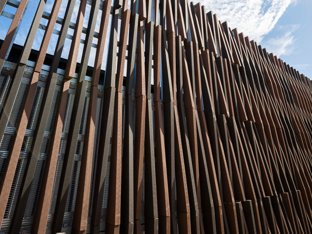 One profile was specially extruded, then cut to create the angled pieces that make up the pattern of the panels and produce the three-dimensional aspect at the heart of the design. To achieve this, Futurewood established a special process that allowed two angled battens to be cut from a larger rectangular piece, meaning virtually no waste during production. In addition, this process generated a rough-sanded face on the three visible sides of the battens, allowing the textural intention of the architectural team to come to life once the multidirectional battened panels were constructed.