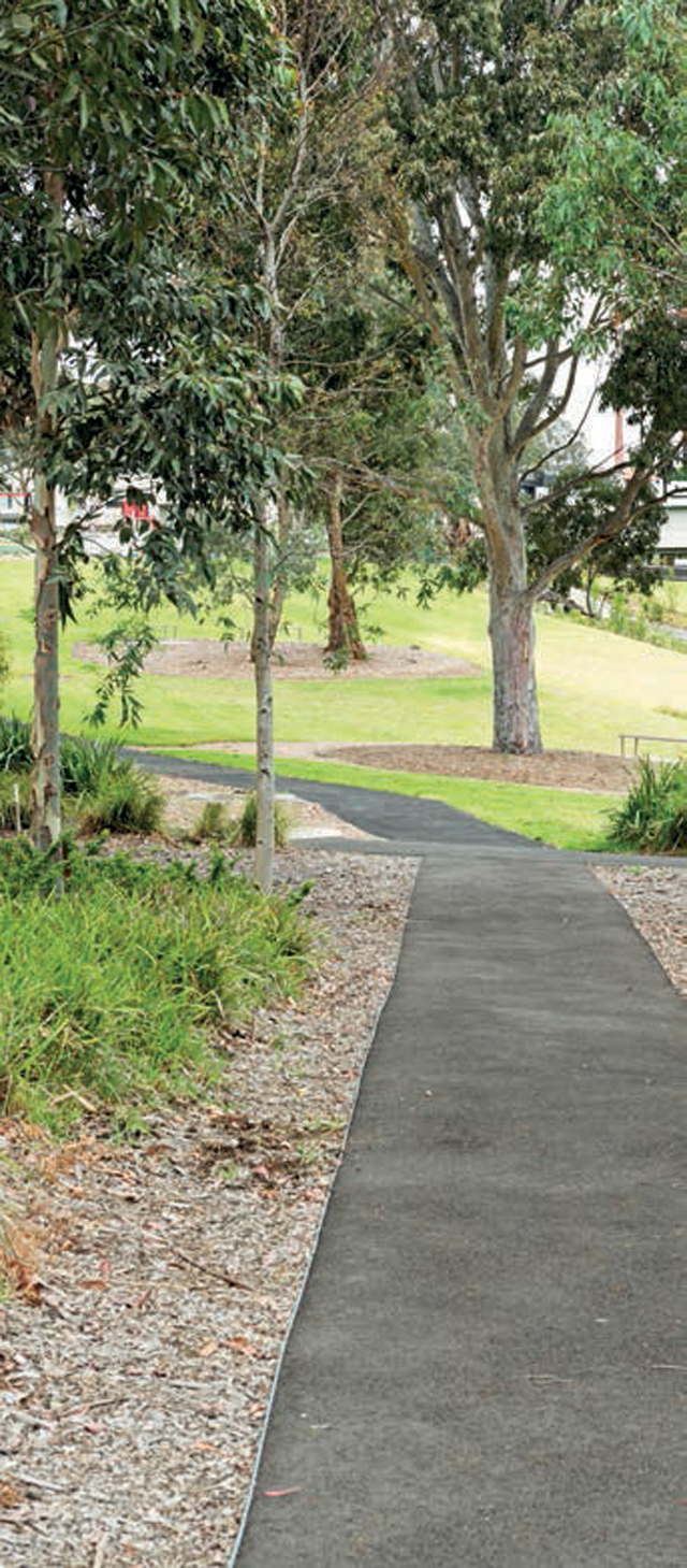 Greenlines Gardenware was called upon to supply the FormBoss™ steel edging system. The galvanised 100mm profile of 2.0mm gauge, with the rolled top edge of 6.5mm was used throughout the whole project. These edges were installed to define bitumen paths throughout the landscaped areas, and in gardens to separate areas of rocks from mulch, or grass.