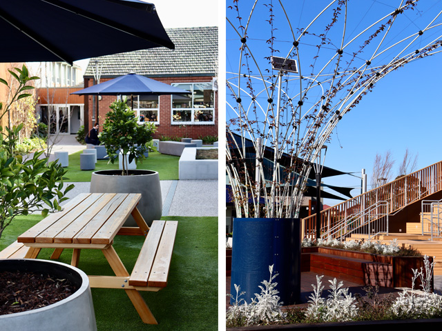 Continuing the biodiversity education of the students, feature pots and raised planters also feature predominantly throughout the space. Bulge pots are planted with citrus trees that teach students to grow, maintain and produce their own produce, and rectangular planters are planted with perennial flowering plants to add colour to the space. Raising the planters protects them from potential foot-traffic damage, while the pots themselves create immovable barriers that protect posts and direct student movement.