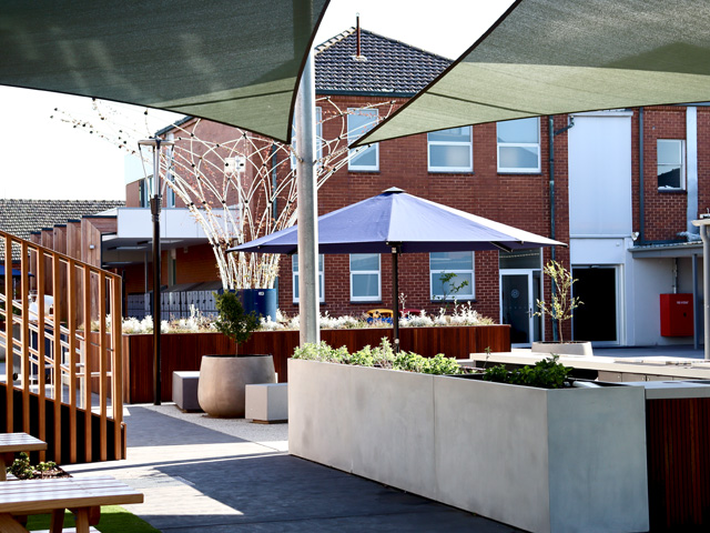 Providing necessary shade, a large multilayered shade canopy reflecting the school colours spans the cooking/eating area. Insitu walls and precast concrete furniture provide seating opportunities and piazza-style umbrellas contribute additional shade to the outdoor cafeteria.