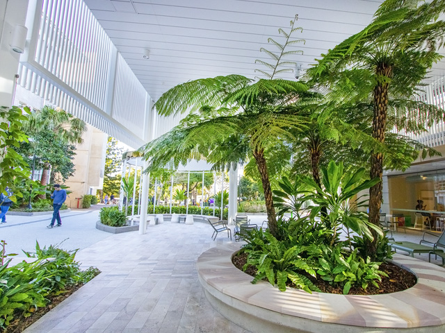 A new student precinct at University of Queensland is flourishing with lush landscaping designed to provide a sheltered retreat for visiting students and faculty.