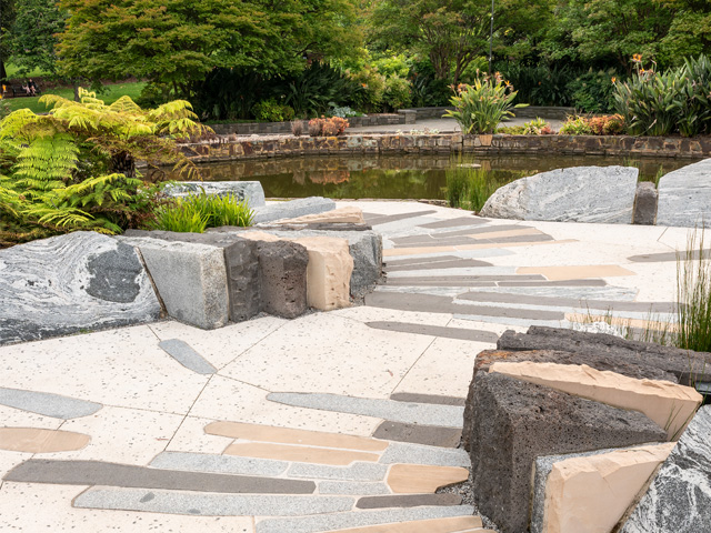 Utilising stone local to the Victoria region (gneiss rock, harcourt granite, Victorian bluestone and sandstone), an enclosed space of organic and fluid lines forms the divided memorial. Each stone was cut with precision to correspond with exact CAD dimensions, to ensure they were installed to accommodate curved radial seating and the cast bronze memorial plaques embedded in the walls — not an easy feat given 160 rocks were installed, some weighing up to 10 tonne.