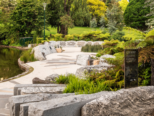 The memorial was designed by Rush Wright Associates who worked in collaboration with CFA, VicSES, City of Melbourne and PTA Landscapes to complete the Victorian Emergency Services Memorial. Transforming an existing turf area and manmade lake, the memorial design forms a complete landscaped garden.