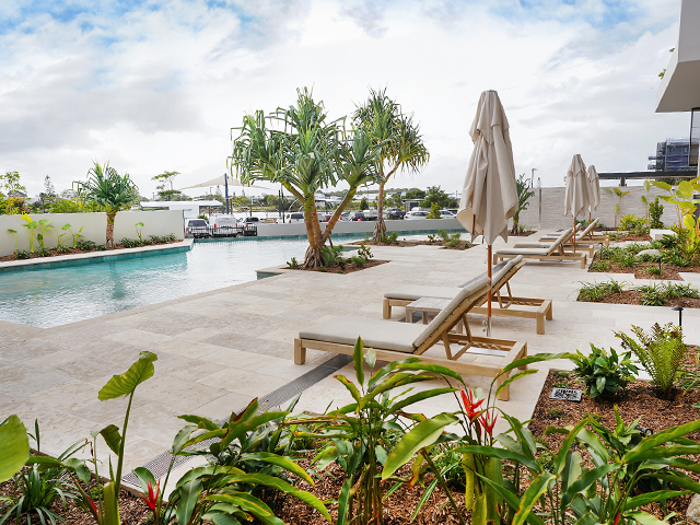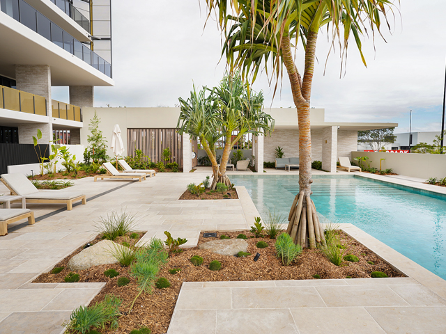 With quality being a byword of the project, the award-winning team from Penfold Projects was commissioned by Evans Built to complete the first stage of the build by delivering a vibrant landscape that seamlessly combines luxury and functional outdoor living with a coastal aesthetic. An elegant, sophisticated and contemporary subtropical haven that complements the modern architecture of the structures, this landscape ticks all the right boxes.