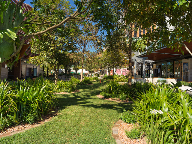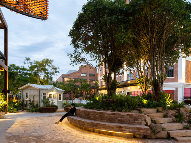 Responsible for the construction of this park-like atmosphere, CBD Landscape Construction utilised sandstone blocks and steppers, along with heritage brick pavers to establish a curvaceous hardscape around which pedestrian traffic flows into and through the precinct. Varied levels not only give the mature fig tree that sits at its centre an elevated position, it folds down to ground level to form convenient seating beneath its shade.