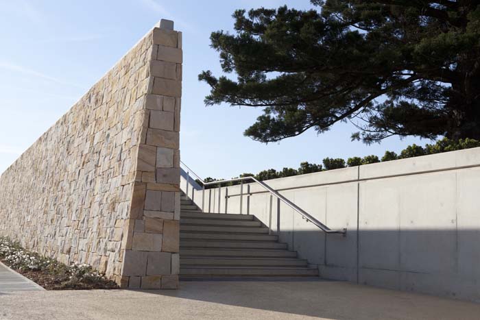 The works also include landmark-sized retaining walls ranging in height up to 4.5m with runs up to 50m in length. They are constructed as Class 2 off-form in-situ concrete structures with sandstone facing. The large retaining walls were formed and poured to full height in one lift in a hit and miss configuration. Sandstone was imported to the site, hand split and roughly squared before installation. The sandstone was then dry jointed and wet fixed to the concrete walls with a rustic finish to reflect the site’s heritage.
