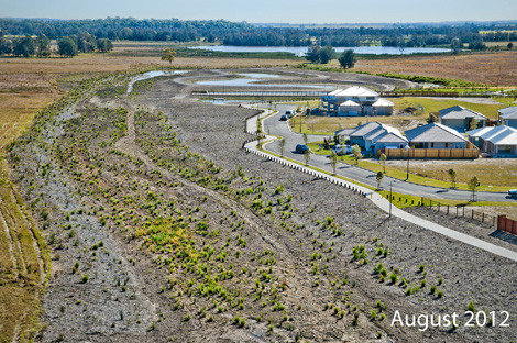 The aim of the project was primarily to allow water flows to pass through an environmental corridor to the significant low lying swamp land to the rear of the estate. Engineering design was to cater for high rainfall events, whilst landscape design was to provide pleasant aesthetic amenity whilst adhering to plant species lists endemic to the area resulting in habitat for local bird species and fish species.
