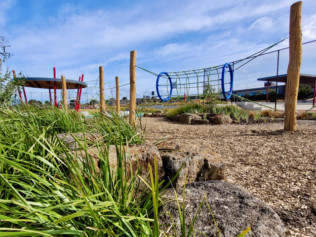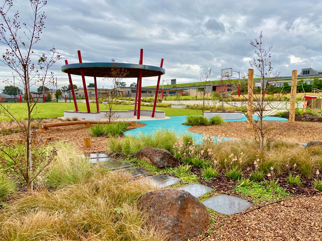 Situated close to the new sports zone is the Circular Shelter. This large, fixed shade structure is a central meeting space for students, offering plenty of room to gather. The steel and timber construction has a unique architectural profile and is easily identified on campus. Edging the structure is a playground area consisting of rubber softfall pathways, feature rocks, logs and rope play elements. Planted with lush greenlife, the adventure space will continue to grow and mature as time goes on. Stone steppers wind through parts of the garden and connects the playspace to two large lawns on either side.