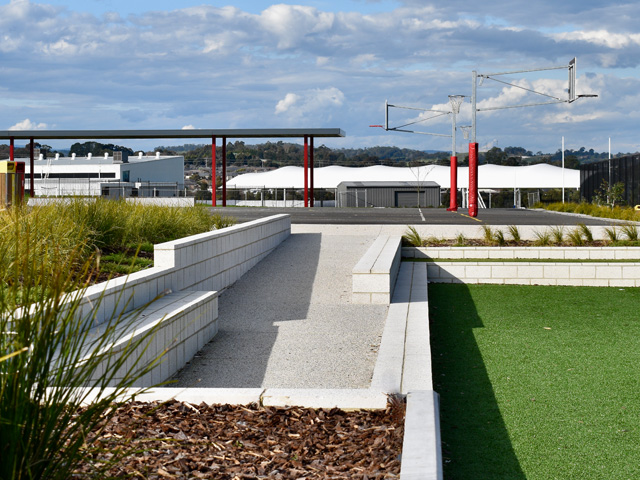 Forming a connection between the synthetic grass area to the south and the rock terrace area, native plants, feature rocks and stone feature steppers were later integrated, while additional landscaping to the carpark embankment kept the lush plantlife flowing around the campus and connected the gardens.