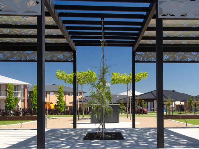 Street Furniture throughout the park is solid and contemporary in design, built to stand the test of time. Shade structures balance soft and hard materials, with creepers trained to grow over the wood and steel structures to soften the whole effect and deepen the shade provided.