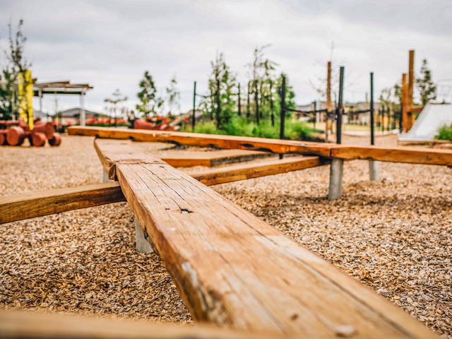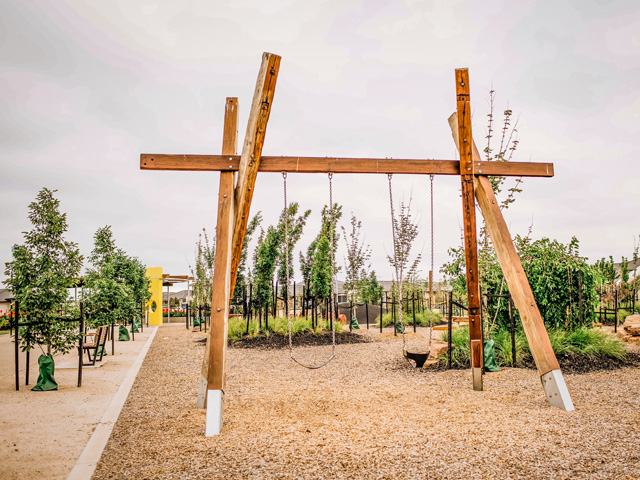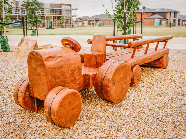 Of particular note are the three timber tractors and trailer carved by renowned Australian wood carver Brandon Kroon. These striking features are a fun addition to the playspace and reflect the rustic charm that defines the development.