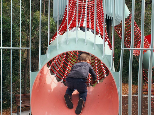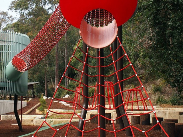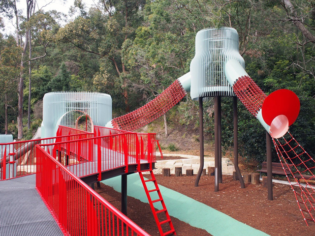 The finned design generates engaging optics while allowing glimpses of the surrounding bushland between the blades, helping it to at once blend with the landscape and project its own vibrant identity. Rope courses, bridges, tunnels, swings and slides connect the three pods in a configuration that offers something to everyone from toddlers to teens. Wheelchair access to the playground means those with mobility challenges can also get in there and engage with their peers, particularly on the purpose-built all-abilities carousel.