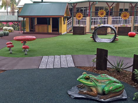 The Lilly Pilly Learning Centre features a hollow log climber and tunnel, a giant mushroom table and chair set, giant pumpkins, tomatoes, daisies and watermelons, as well as a traditional timber ‘club’ house in the College colours. There are also several fossils hidden in the sandpit for discovery. The Gumnut Garden features gum leaf play pods, gum blossom seats, giant toadstools for shade, gumnut arm chairs and a dry creek bed all nestled within the leafy surrounds of May Gibbs’s flowering eucalypts which inspired it all.