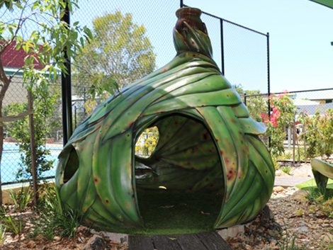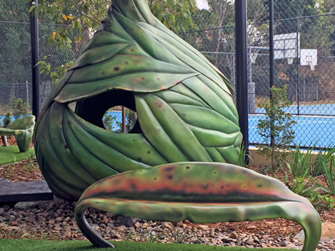 Created on the grounds of A.B. Paterson College on the Gold Coast, the Lilly Pilly Learning Centre and the Gumnut Garden were inspired by the age-old tales of “Snugglepot and Cuddlepie” by beloved Australian author, May Gibbs. Through these playspaces children are transported into a magical world in which their creativity can be ignited; a world in which they feel small and encapsulated by the wonders around them; and a sensory place where they can read inside giant gumleaf pods, sit with their friends on giant flower buds or play on a gigantic caterpillar.