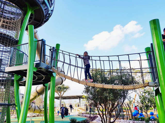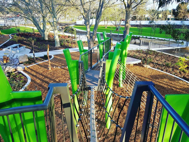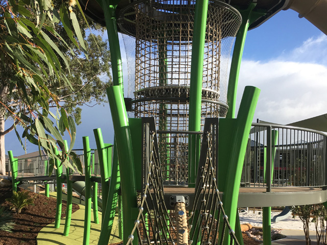 Specifically located to ensure the retention of existing established trees, the park has plenty of green to enhance its jungle-like motif. At the centre of the park a 7-metre-high “bird’s-nest-in-a-tree” adventure tower takes pride of place, offering those brave enough to scale its heights great views over the nearby wetlands. Wanting to establish a treetop adventure-based experience for park users, extensive climbing opportunities were incorporated into the playspace — making one feel they are indeed swinging through a leafy canopy of trees.