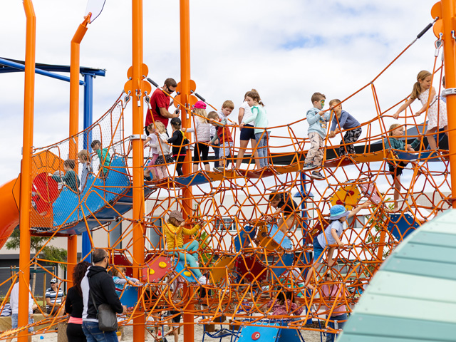 The newest playground on site is Dino Park. Brought to life by play equipment specialists Urban Play, Dino Park features the mighty Aurasaurus, a 6.6-metre-high custom-designed play structure. Spanning 21 metres in length, the Aurasaurus’s body is formed by a gigantic three-dimensional octahedron climbing net. Vibrantly coloured panels form the dino’s head while on the other end a tube slide tapers off to form a tail.