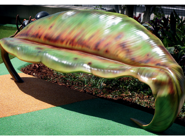 Sculpted natural play elements include a Giant Tree Stump Cubby and Slide, a Bower Bird’s Bower complete with Giant Peg and Milk Bottle Top, a Hollow Log Tunnel and Climber, two Giant Ants and a Bougainvillea Pollen Dome Climber. Complementing these elements are magnificent Indigenous artworks, a Bee Play rocker, natural planted areas, sound and discovery elements and a range of engaging play panels.