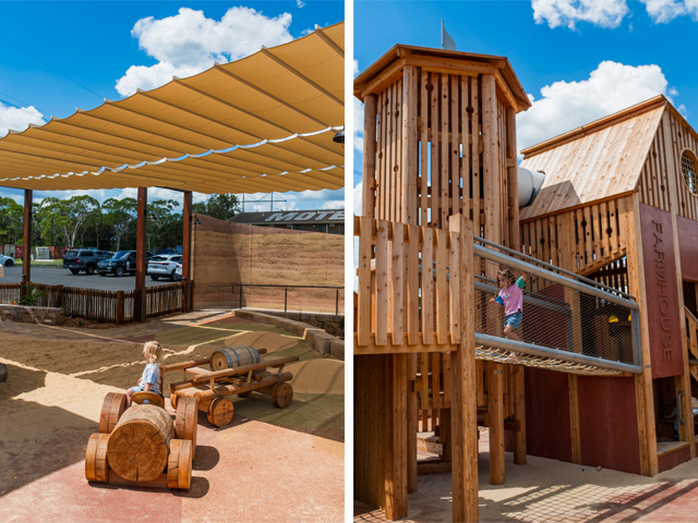 The central play structure is a bespoke cubby made of larch timber that anchorsthe farmhouse narrative. Surrounding elements, including barrel-inspired tables and chairs, a timber tractor and trailer play sculpture and a stainless-steel grain silostyle slide, reinforce the agricultural theme,
