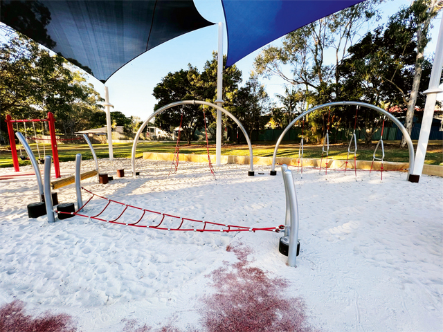 While the youngsters are immersed in their adventures, parents can discover their own sanctuary of peace and relaxation along the sandstone blocks that gracefully line the course’s perimeter. These sandstone blocks serve a dual purpose, adding to the aesthetics of the park, while also providing a comfortable seating option that allows parents and carers to keep a watchful eye. Under the shade sails and the gentle cover of surrounding trees, parents can find respite from the sun’s rays and enjoy a tranquil moment amidst the bustling energy of regular playtime.