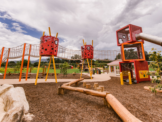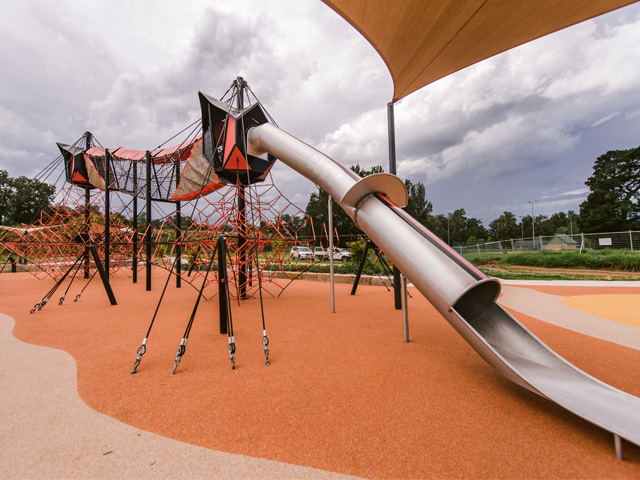 The nearby Youth Zone offers older children and teenagers the chance to explore a variety of physical adventures, including a flying fox. Going with a Redback Spider theme, KOMPAN installed large Octanets at the centre of this area alongside a Redback Sky Walk with a large red and black striped slide.
