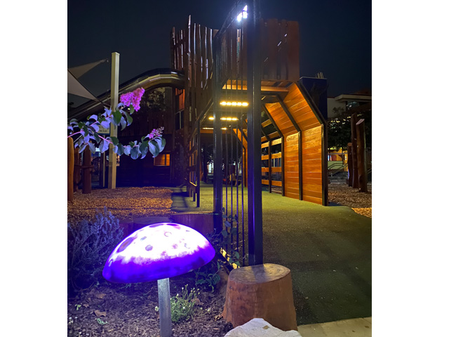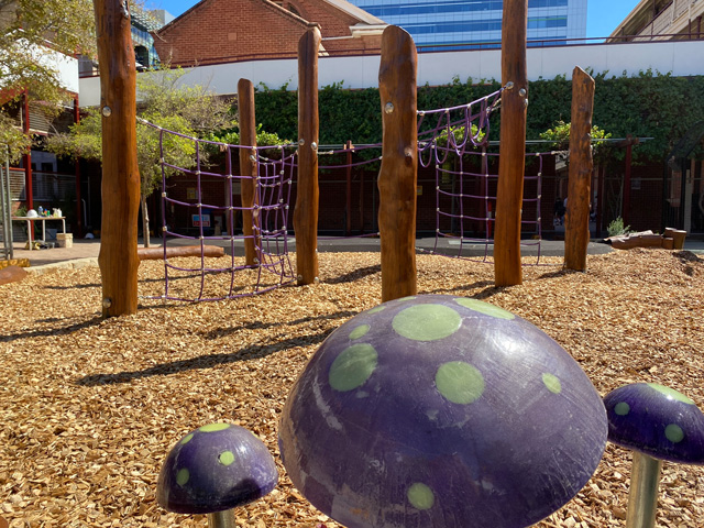 Glowing toadstools and woven arbors set the stage for this inner-city playscape.