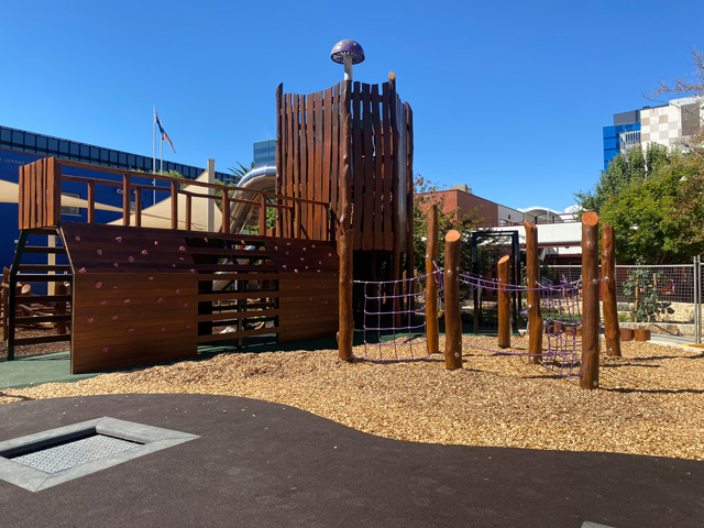 Extensive soft landscaping and a large grassed area provide the beauty of nature in this inner-city setting. Curved pathways and rounded edges soften the landscape design and add a whimsical element to the playspace.