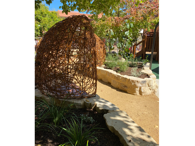 Working to this brief, Climbing Tree Creations was able to design and construct a playscape that offers a variety of play challenges. Utilising locally sourced rock and timber, the team built raised garden beds edged in natural rock and filled with native grasses and shrubs. Seating benches were built into the rock walls and covered with woven timber shade structures that offer a nest-like ambience, perfect for curling up with a book or gathering with friends.