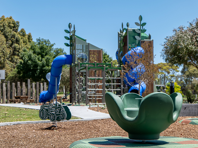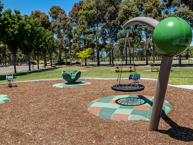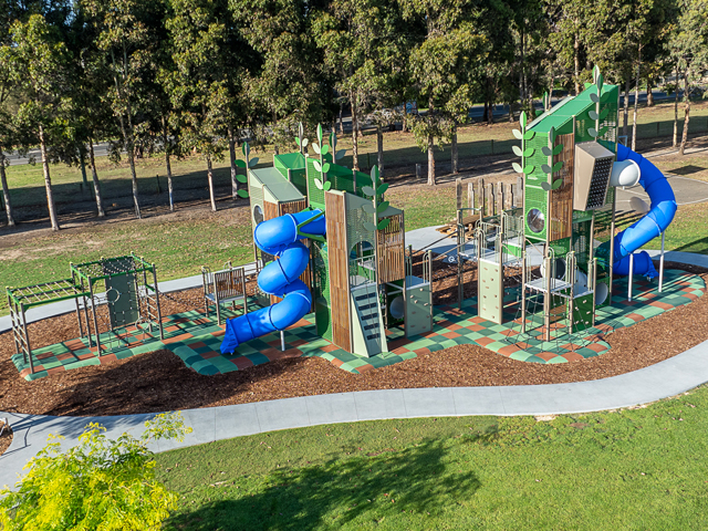 A pathway runs the entire perimeter of the playspace, providing ease of access for everyone, as well as a fun path for scooters and bikes. Timber picnic settings dot the edges of the park to allow parents and guardians a spot to sit and dine. Alternatively, supervision is made easier by raised concrete benches that form part of the outer edges of the play areas and make for a handy seat. Landscaped garden beds planted with native greenery finish off the final design, softening the edges of the spaces and providing a little welcomed shade.