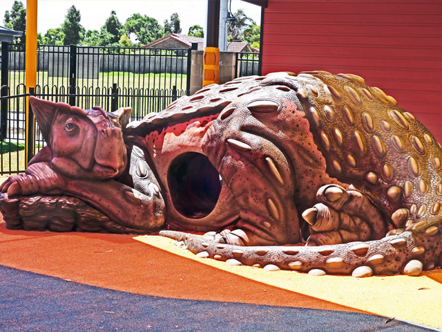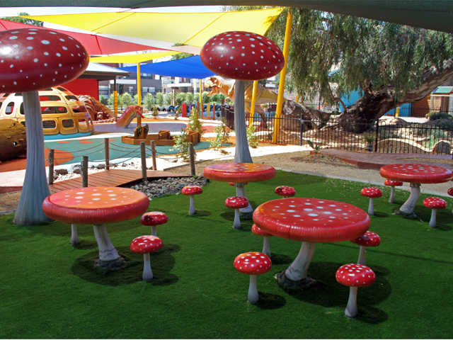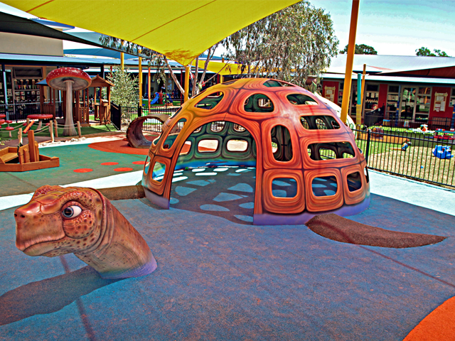 Utilising their Art for Play range of interactive sculptures, which can be combined in myriad ways, Jungle Play populated the engaging playspace at Little Learners with a menagerie of caterpillars, snails, ants, frogs and ladybirds. There’s even a ferocious T-Rex — comically restrained by a tiny fence — and an ancient sea turtle with obliging footholes that allow children to scale his colourful shell. A Gum Leaf Pod House and Gum Blossom chairs together with a Hollow Log climber and tunnel round out the space.