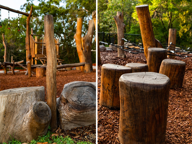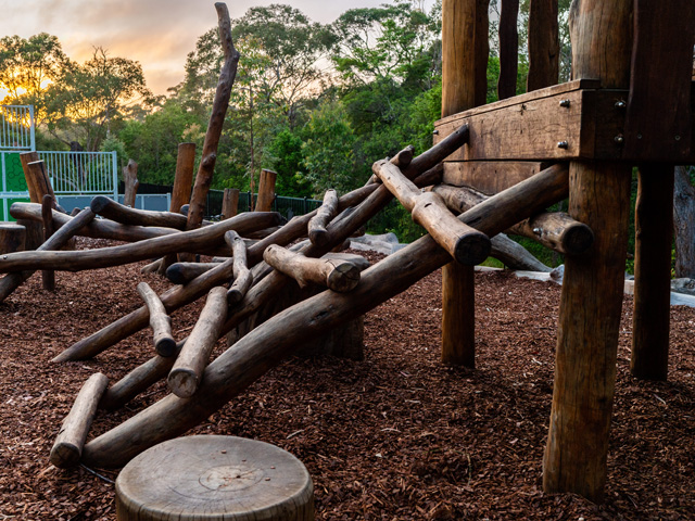 Created from several stunning pieces of salvaged timber rescued from various local sites, a series of flexible seating structures and balancing play pieces also dot the space. Timber logs up to 10 metres in length were made playground-safe and consciously placed to create a direct pathway to the connecting bushland, while others serve as sustainable seating options.