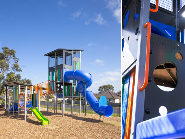 Creating a compact yet vibrant space that accommodates play and adult leisure, Victoria Park features a custom-designed central tower from which a range of play activities emerge. A spiral slide, underdeck rope activities, junior slide and ground-level elements provide an array of play challenges for all levels. The modern-industrial-style tower surges skyward, offering intrepid climbers great views over the landscape, set off by the vivid colours of its construction. Sprouting various elements in bright shades of orange, green and blue, the tower sits alongside a more subtle play area.