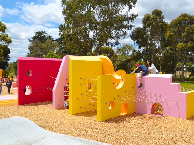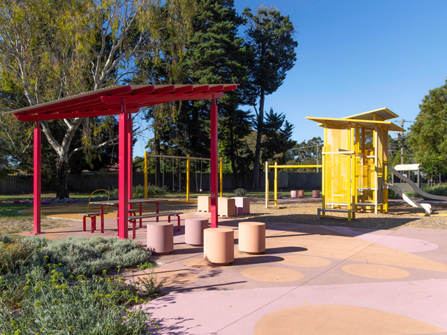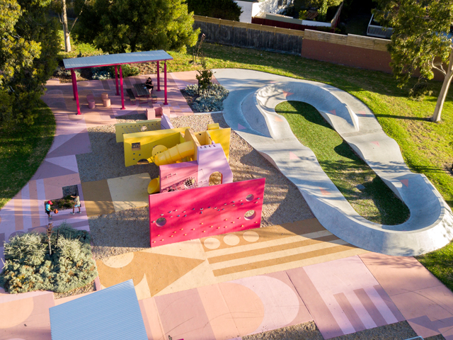 With two separate reserves set on either side of an existing residential street, Council looked at how they could create two playspaces with a different age focus to complement each other. Traffic calming and appropriate access became a key focus of the project. Playce was required to connect the two spaces visually and also deal with the potential traffic hazard. This constraint ended up driving the design aesthetic. The use of vibrant colour, both on the ground and within the playscapes, therefore became critical to tying the two spaces together and clearly articulating crossing points for access. The resultant design of both spaces is a dynamic kaleidoscope of oranges, pinks and yellows that are both vibrant and iconic, connecting the two reserves visually.