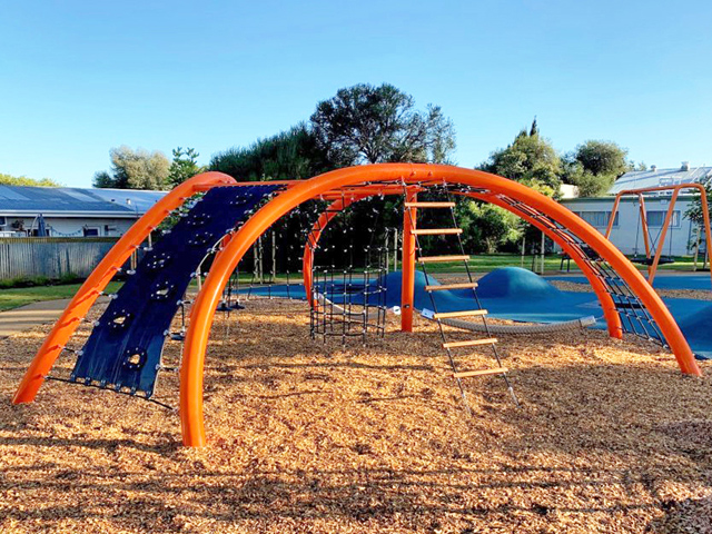 Outfitted by Kaebel Leisure, the new playground features brightly hued structures that beg to be climbed up, swung from, spun around or hung upside down on! Creating an open, dynamic, multi-sport space to meet the project brief, Kaebel Leisure also installed one of its popular Spaghetti Swish structures, supporting an array of rope play options.